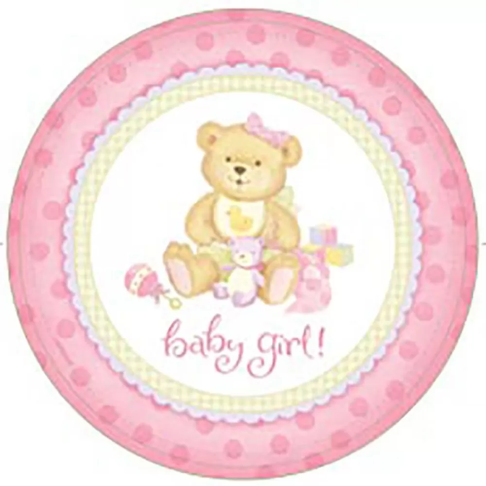 - В наборе 8 бумажных одноразовых праздничных тарелок с мишкой Тэдди и надписью Baby Girl.