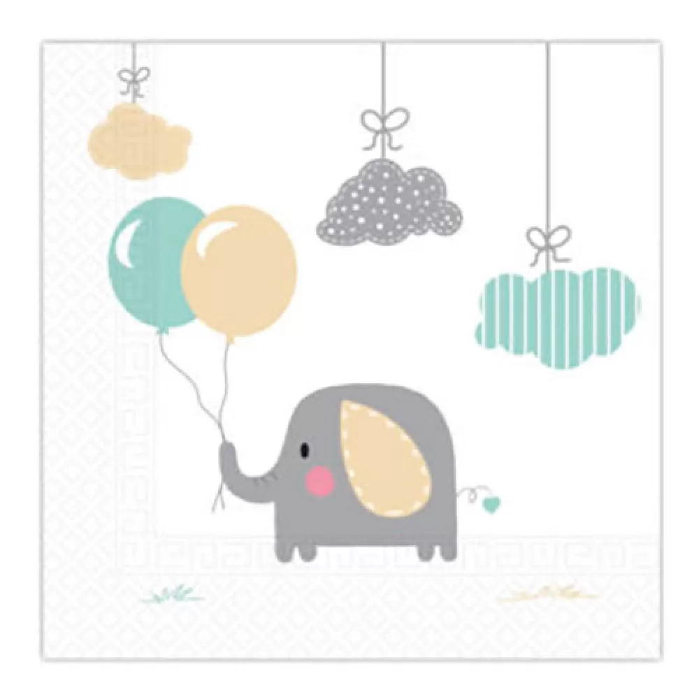 - В упаковке 20 салфеток с милым слоненком с воздушными шариками для вечеринки baby-shower.