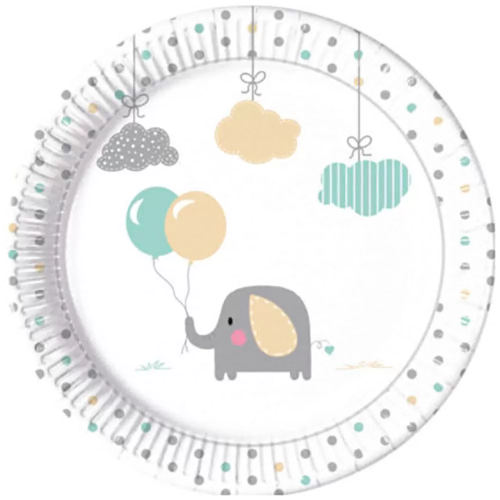 - В упаковке 8 больших ламинированных бумажных тарелок с милым слоненком с шариками для baby shower.