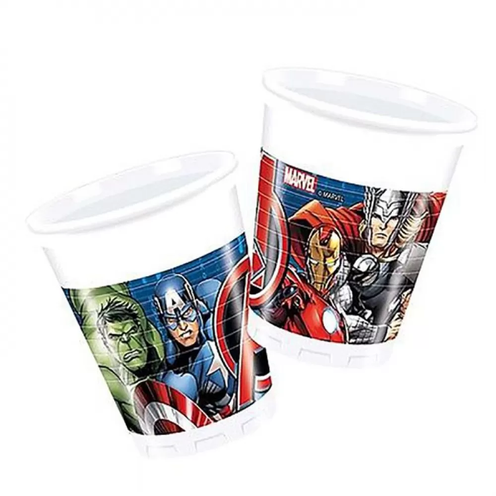 - В упаковке 8 пластиковых стаканов с героями мультфильма «Мстители».