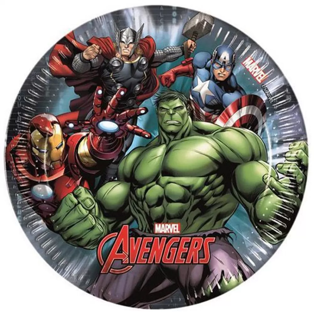 - Большие одноразовые тарелки Мстители, в упаковке 8 ламинированных бумажных тарелок для праздника с героями мультфильма «Мстители».