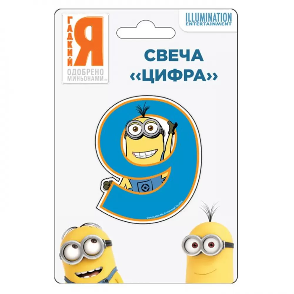 - Фигурная свеча Миньон «Цифра 9» (высотой 8 см) с забавным героем мультфильма «Гадкий Я» украсит торт ко Дню Рождения.Забавная свеча-миньон даже самый обычный торт легко превратит в праздничный.
