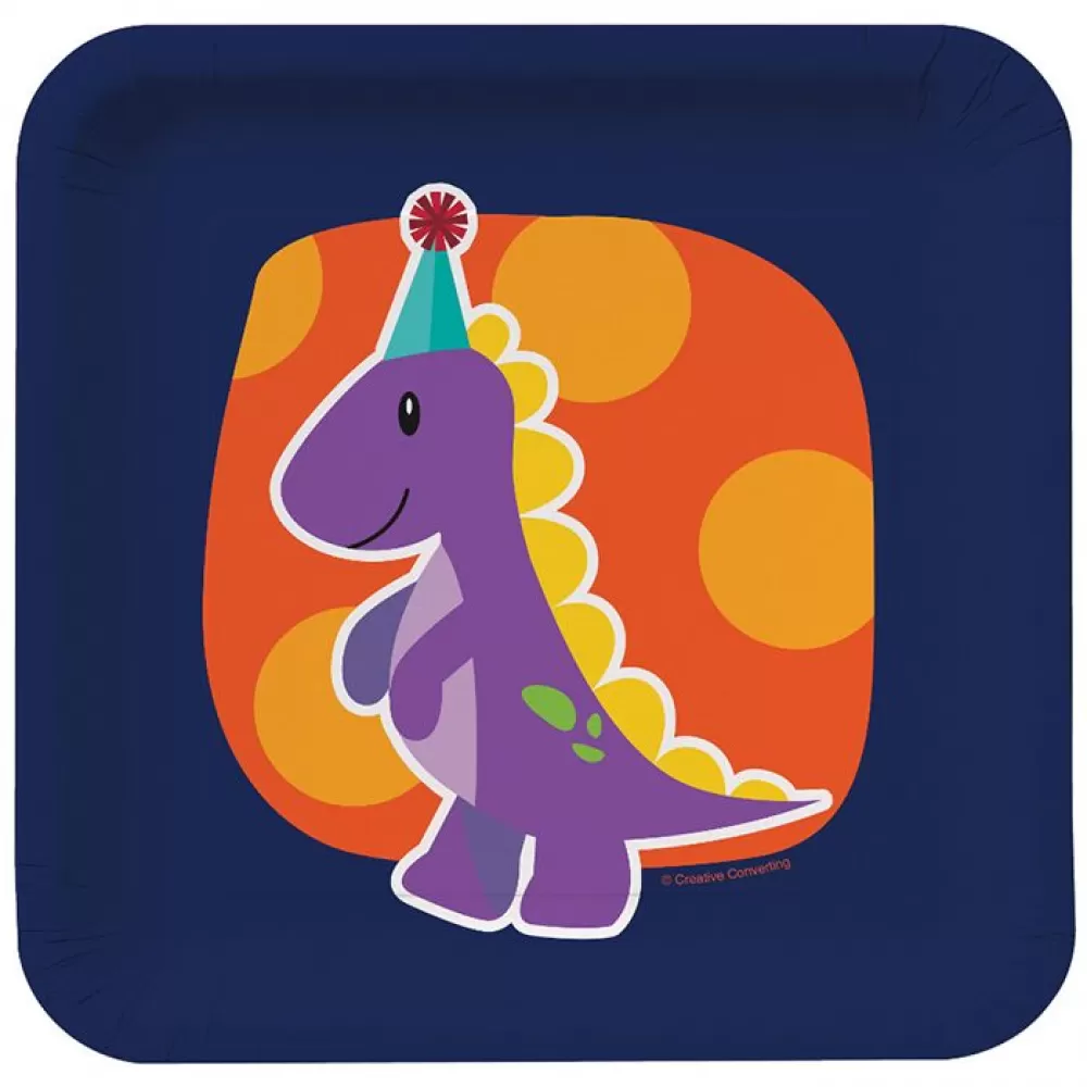 - Праздничные бумажные тарелки с маленькими динозаврами. В наборе 8 квадратных тарелок, размер тарелки 17 см.