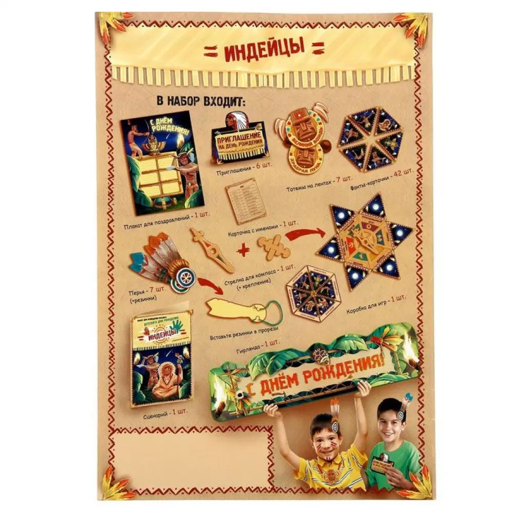 Украсьте место проведения праздника нарядной гирляндой, напишите оригинальные и пожелания на плакате. Переоденьтесь в настоящих индейцев, разыграйте готовый сценарий или придумайте свой! И не забудьте про отличное настроение! Упаковка - пакет с подложкой.
