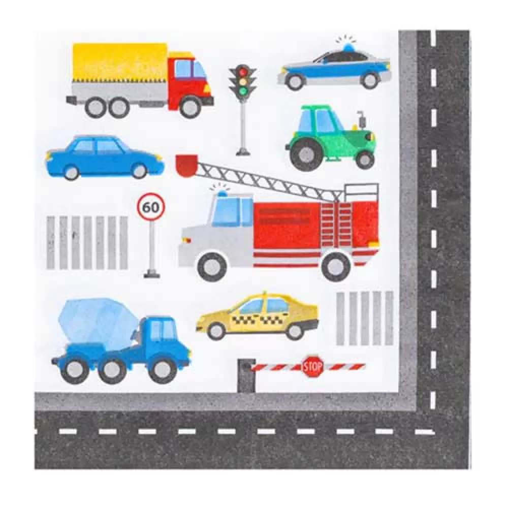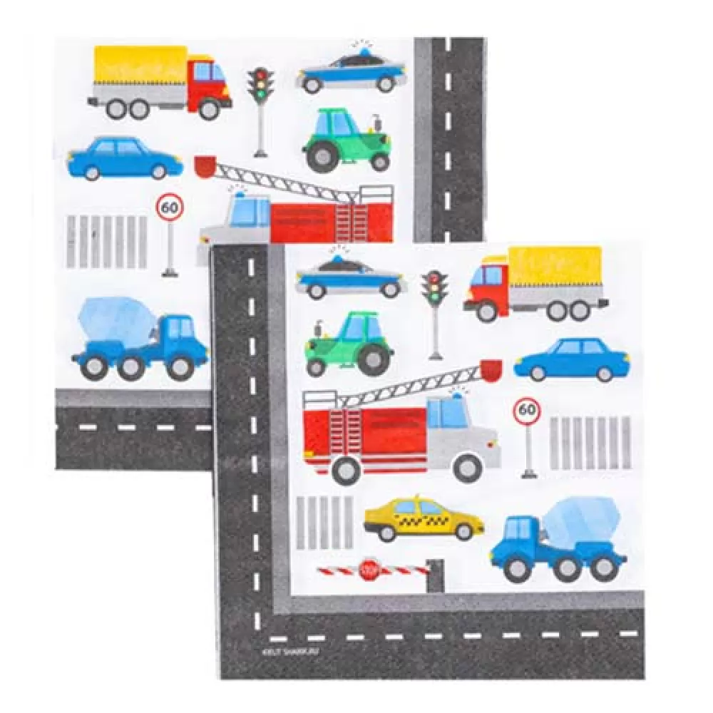 - На праздничной салфетке - светофор, проезжая часть, такси, полицейская машина, трактор, бетономешалка. Все машинки - лучшие друзья мальчишек - на вашем празднике! Эти салфетки с машинами служб быстрого реагирования - именно то, что вам нужно, чтобы спасти праздник от беспорядка.