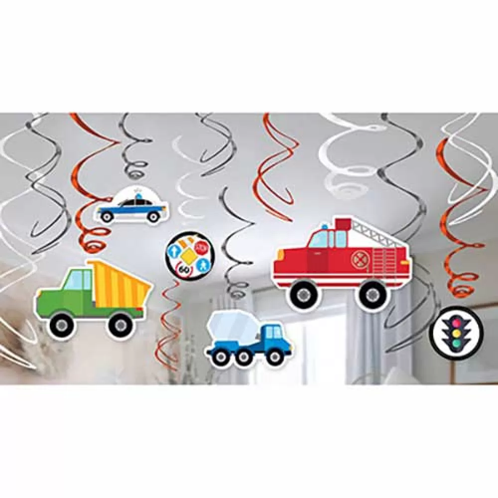 - В упаковке 12 спиралей - 6 с подвесками и 6 простых спиралей для украшения вечеринки, длина варьируется от 46 до 60 см. Подвески - полицейская машина, самосвал, дорожные знаки, бетономешалка, пожарная машина, светофор.