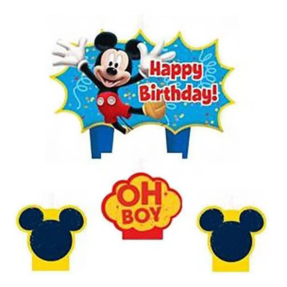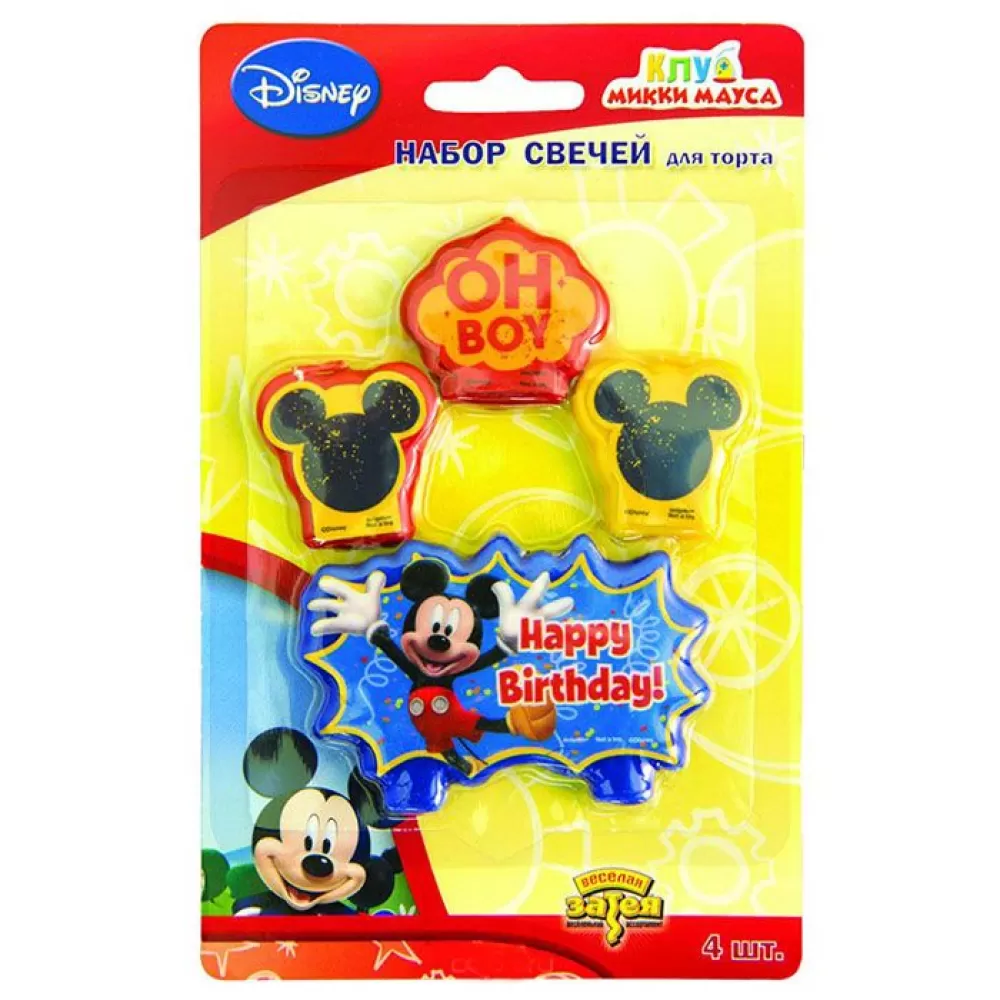 - В наборе 4 фигурные свечки с наклейками с Микки Маус: большая табличка на ножках Happy birthday, красная и желтая свечки с головой Микки и красная табличка Oh boy.
