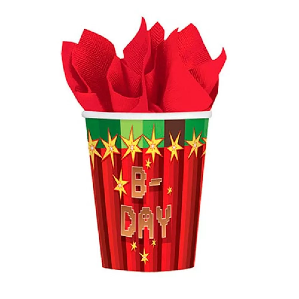 - В наборе 8 бумажных стаканов с принтом в стиле игры Майнкрафт, объем стакана 270 мл.