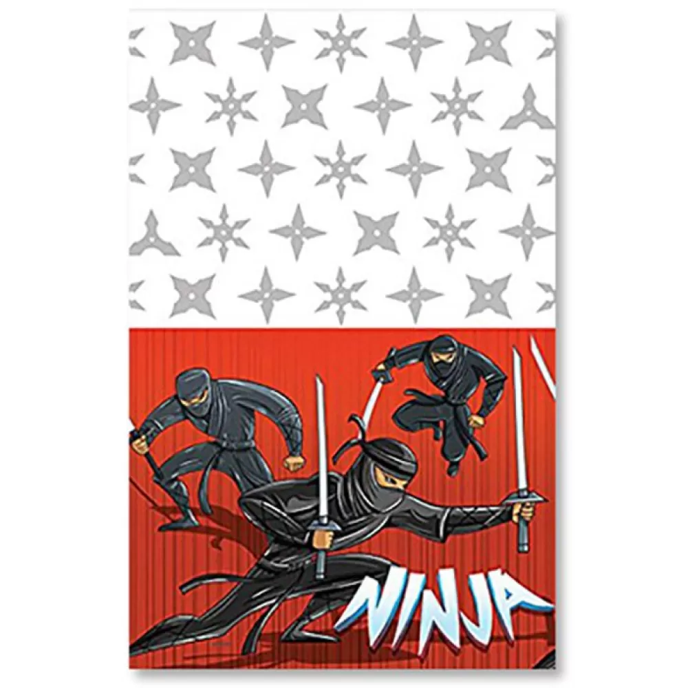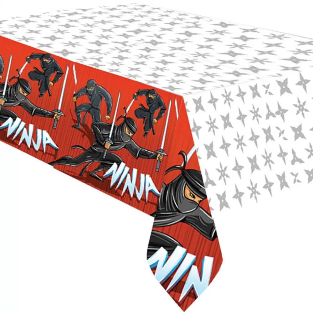 Скатерть «Ниндзя» с разбросанными по белому полю сюрикэнами и красной канвой с принтом.