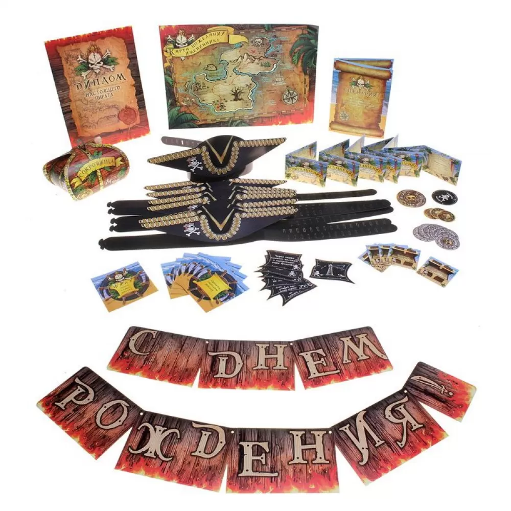 В наборе для проведения детского праздника «Пираты» есть все необходимое для веселой пиратской вечеринки: