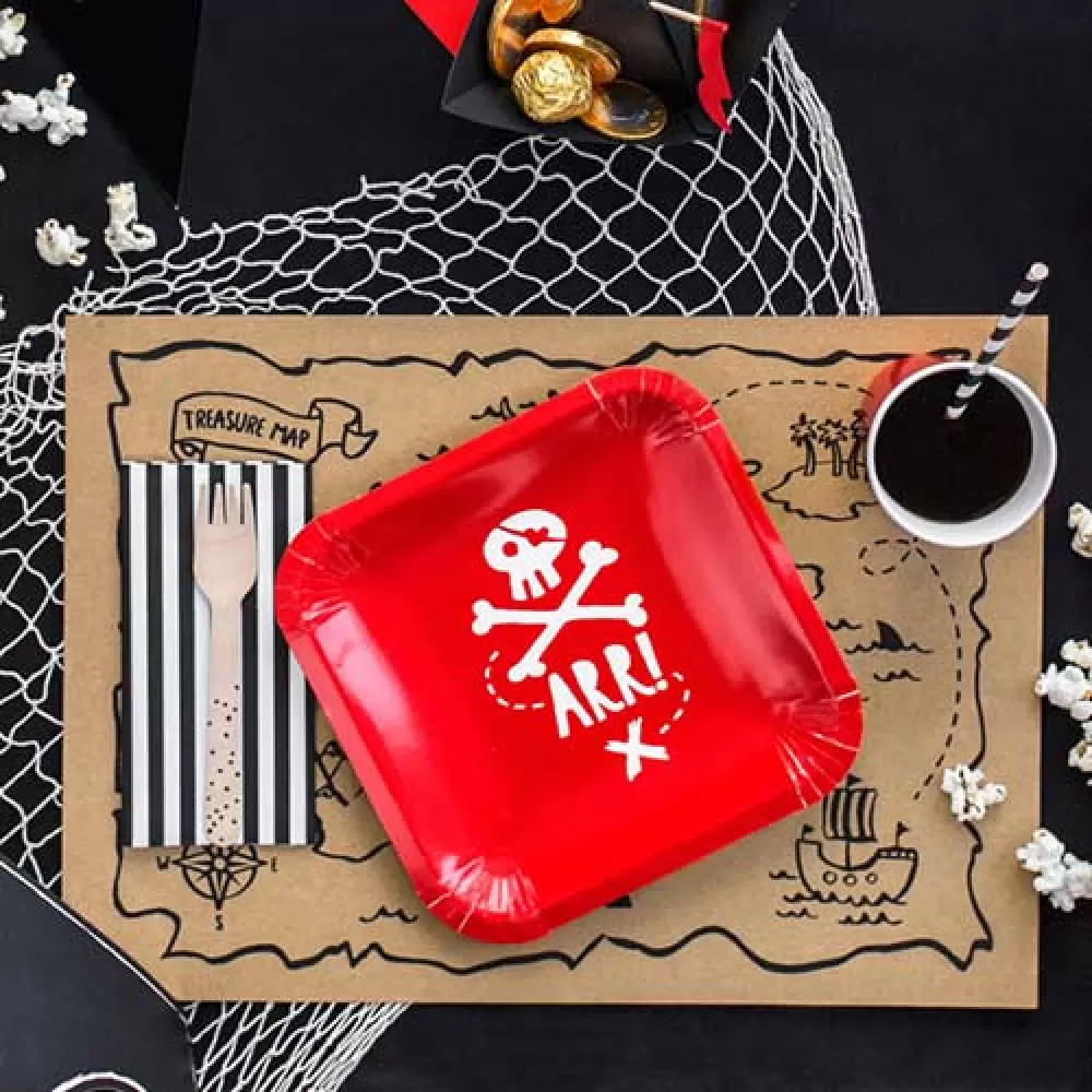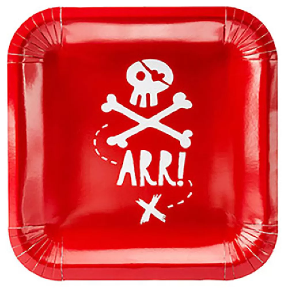 - В упаковке 6 квадратных бумажных красных тарелок с пиратским принтом.