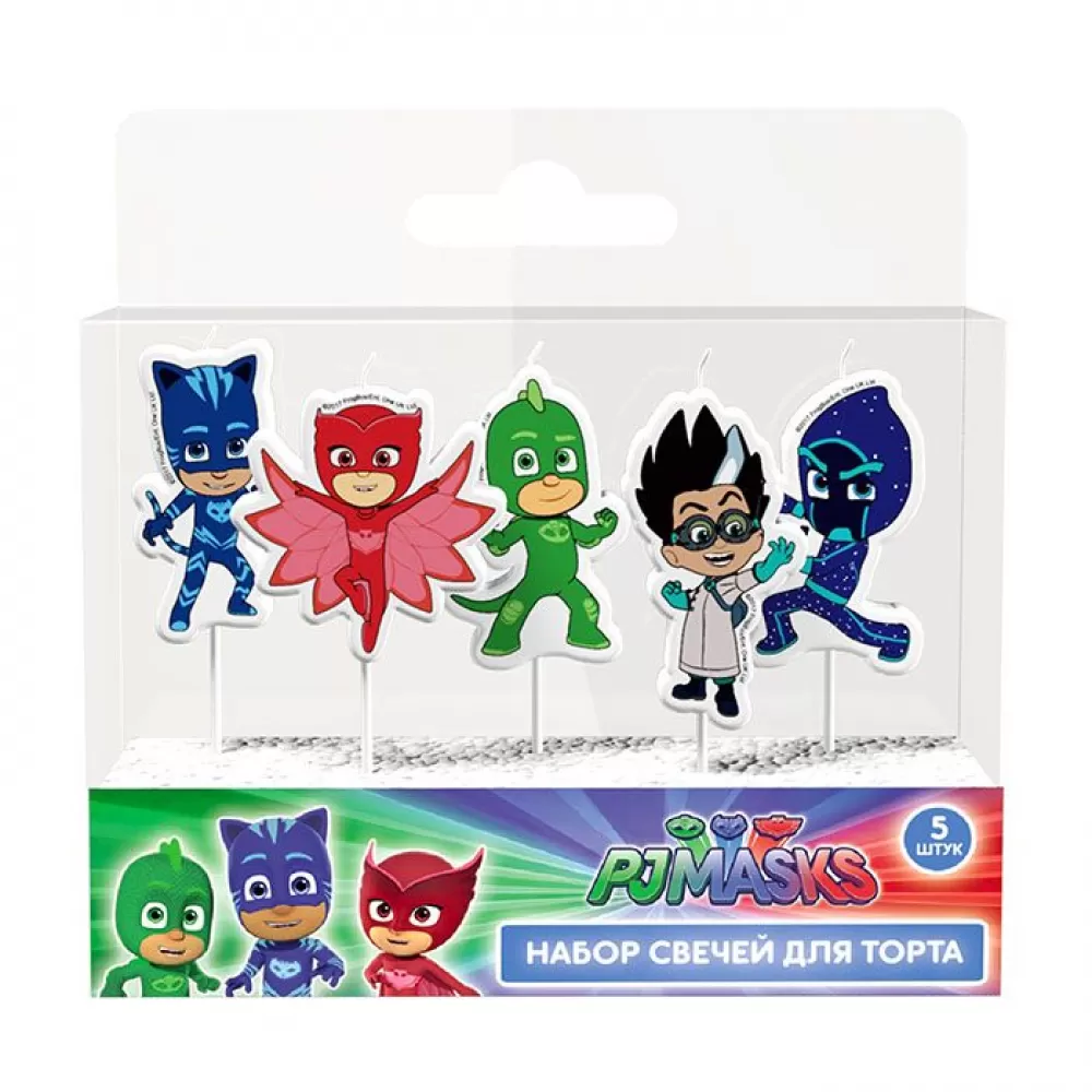 - В наборе «Герои в масках» 5 фигурных свечей в виде героев мультфильма с пластиковыми держателями.