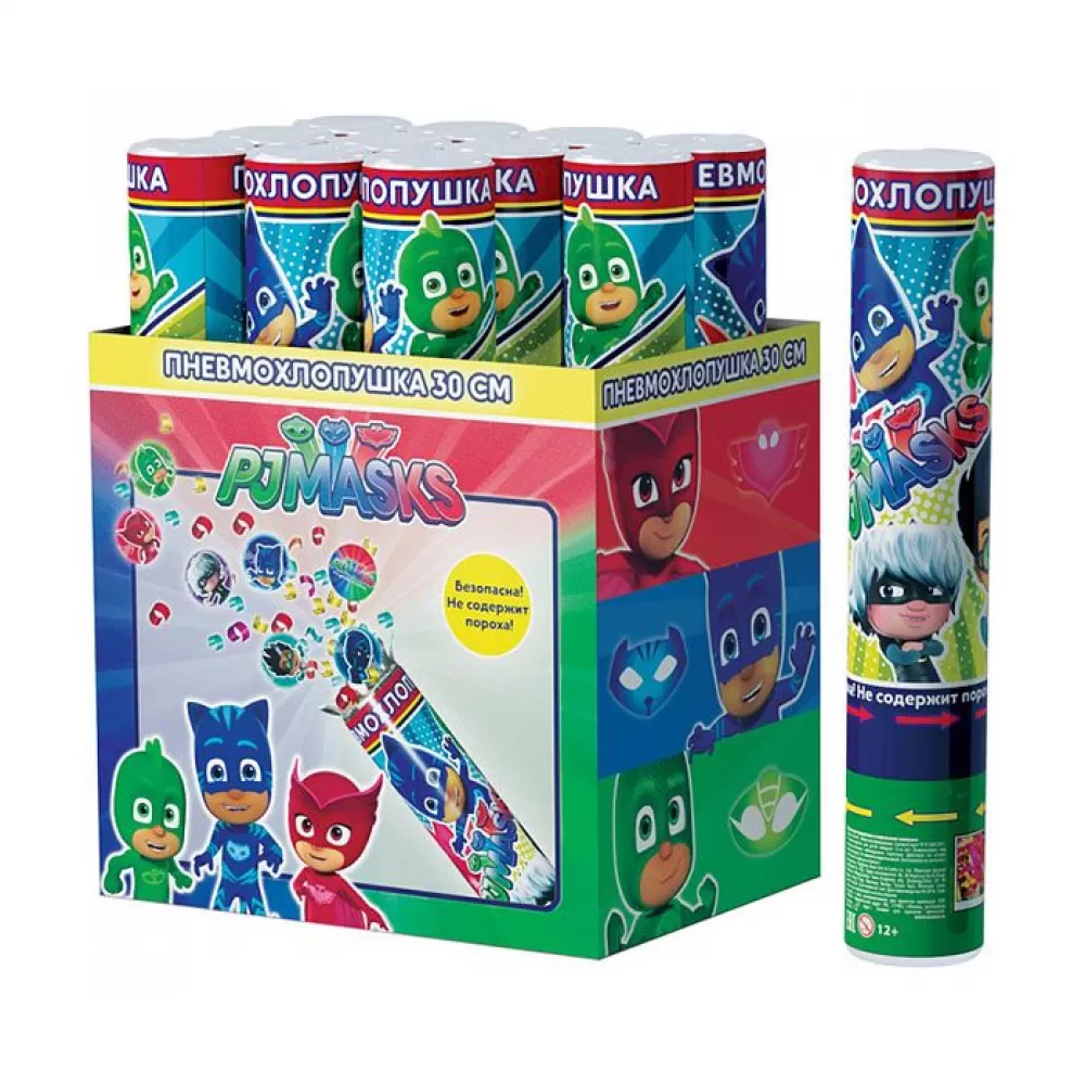 -  		Пневмохлопушка «Герои в масках» высотой 30 см, наполнение - конфетти круглой формы с изображением героев мультфильма PJ Masks.