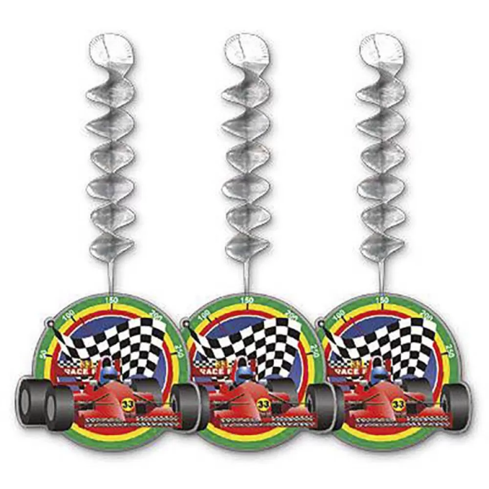 - Блестящее украшение интерьера с изображением болида Формулы 1 - подвески на фольгированных спиралях: золотой, синей, красной.