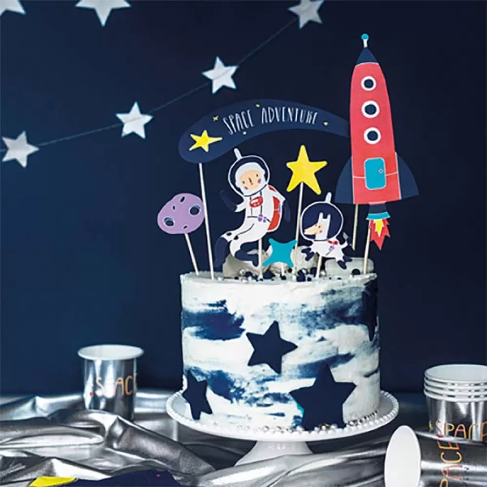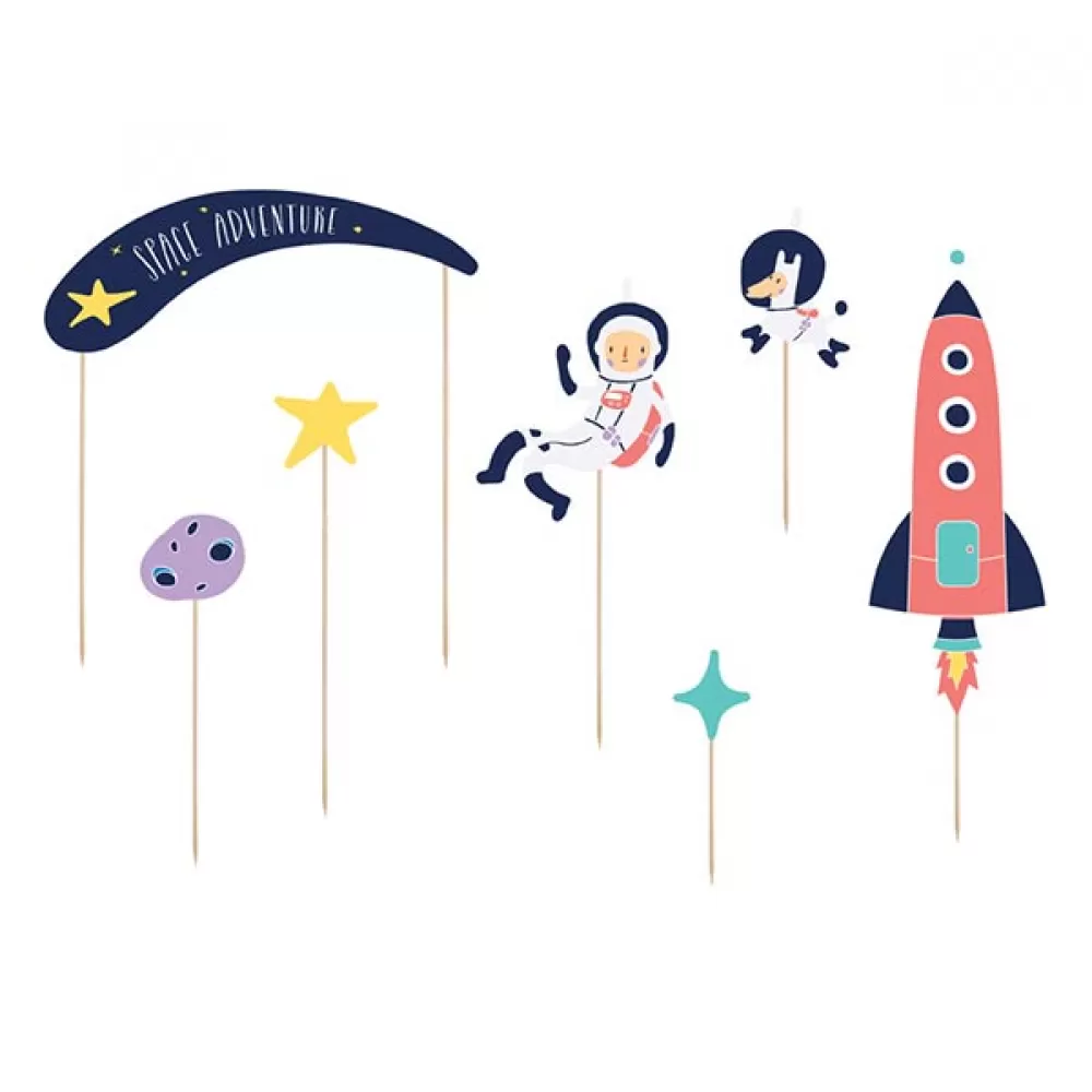 - Топперы Космос на деревянных шпажках: космонавт, собака-космонавт, комета, ракета, планета и звезды.