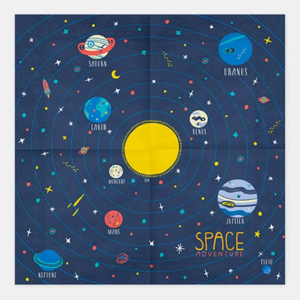 - В упаковке 20 трехслойных салфеток с космическим принтом и планетами.