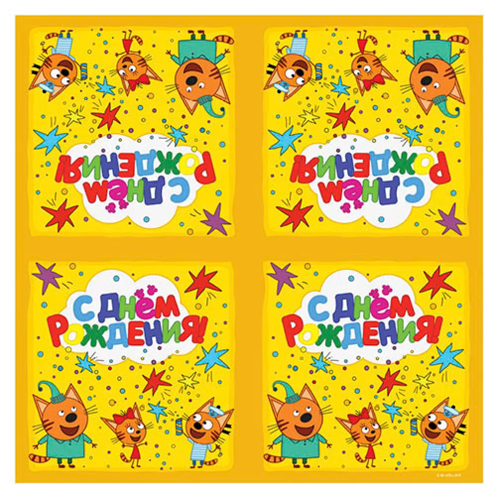 - Салфетки «Три кота», желтый дизайн, размер салфетки 33х33 см (в сложенном виде 16,5х16,5 см).