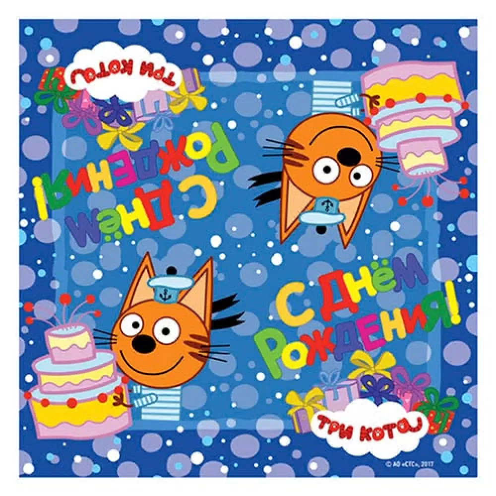 - Салфетки «Три кота», голубой дизайн, размер салфетки 33х33 см (в сложенном виде 16,5х16,5 см).