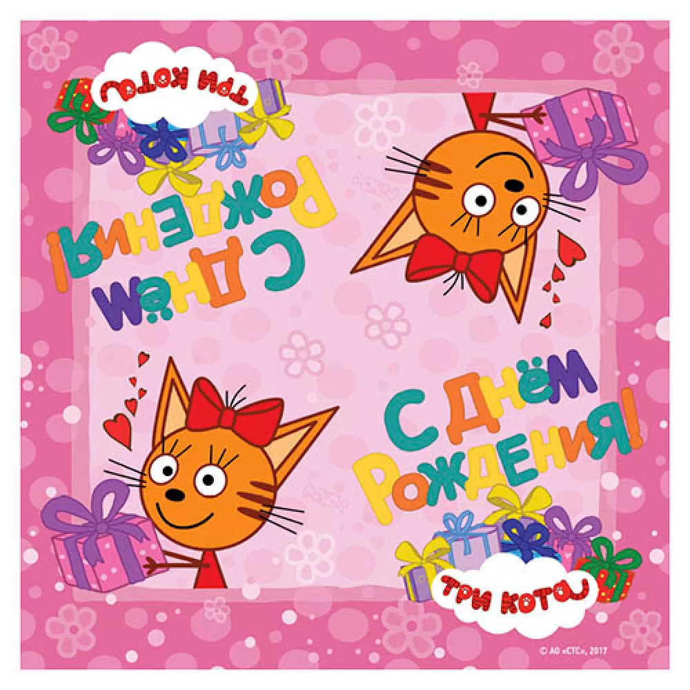 - Салфетки «Три кота», розовый дизайн, размер салфетки 33х33 см (в сложенном виде 16,5х16,5 см).