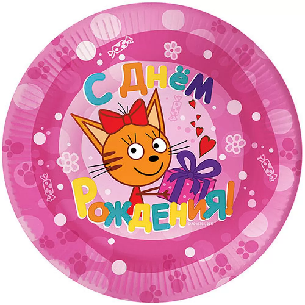 - Одноразовые тарелки «Три кота», розовый дизайн, в наборе 6 бумажных тарелок диаметром 18 см.