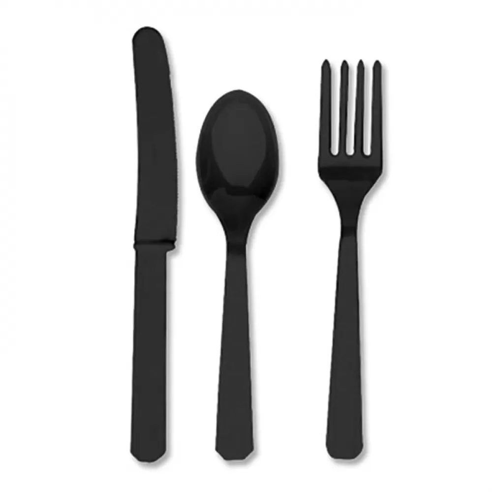 - В наборе 24 столовых прибора на 8 персон черного цвета (нож, вилка, ложка - по 8 шт.).