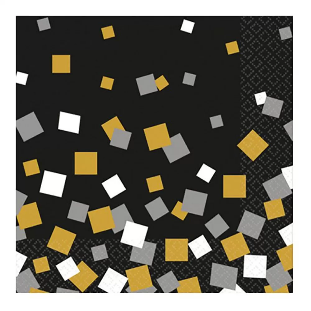 - Лаконичные салфетки с серебряным и золотым конфетти на черном фоне отлично дополнят оформление стильного праздника.