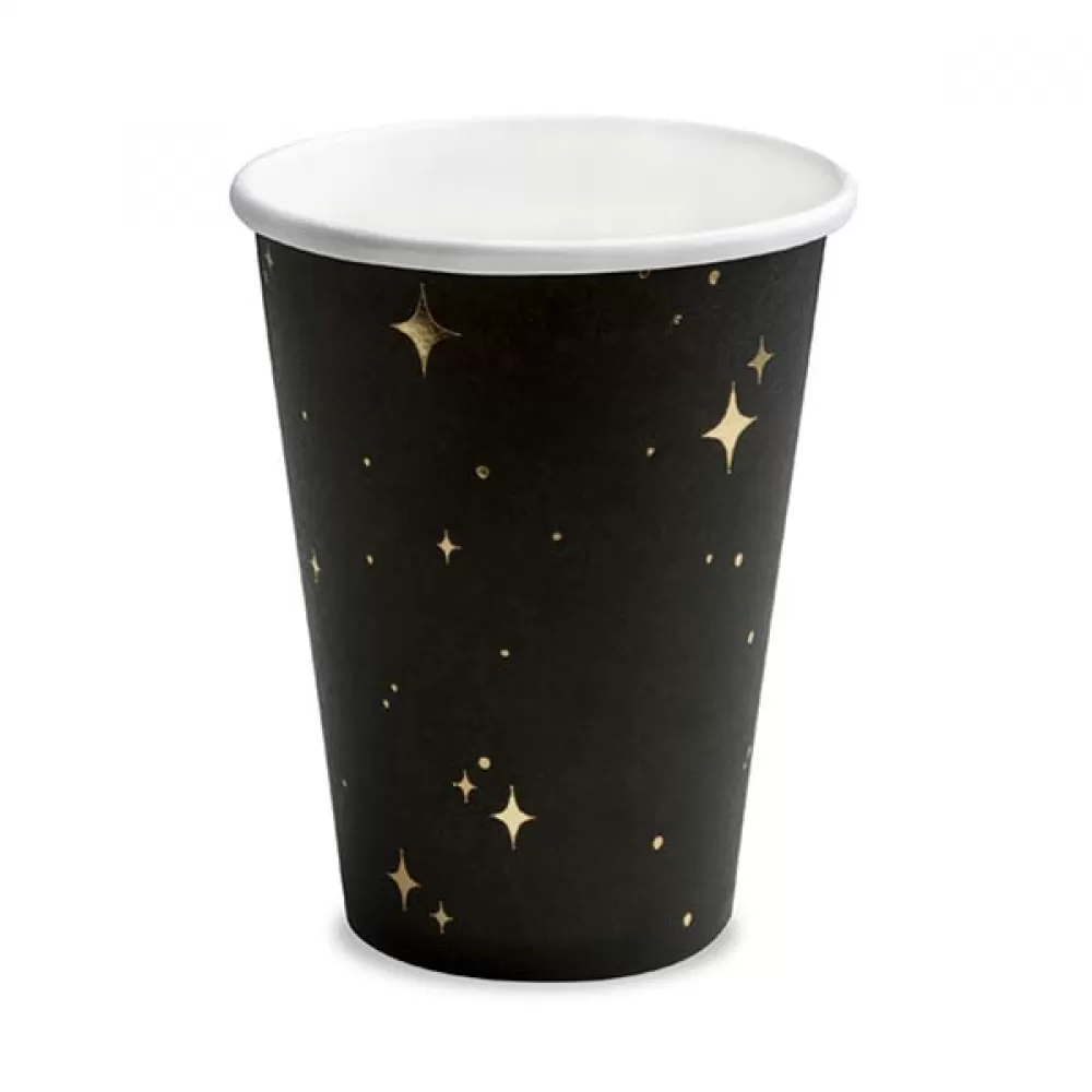 - В наборе 6 бумажных стаканов черного цвета с золотыми искрами.