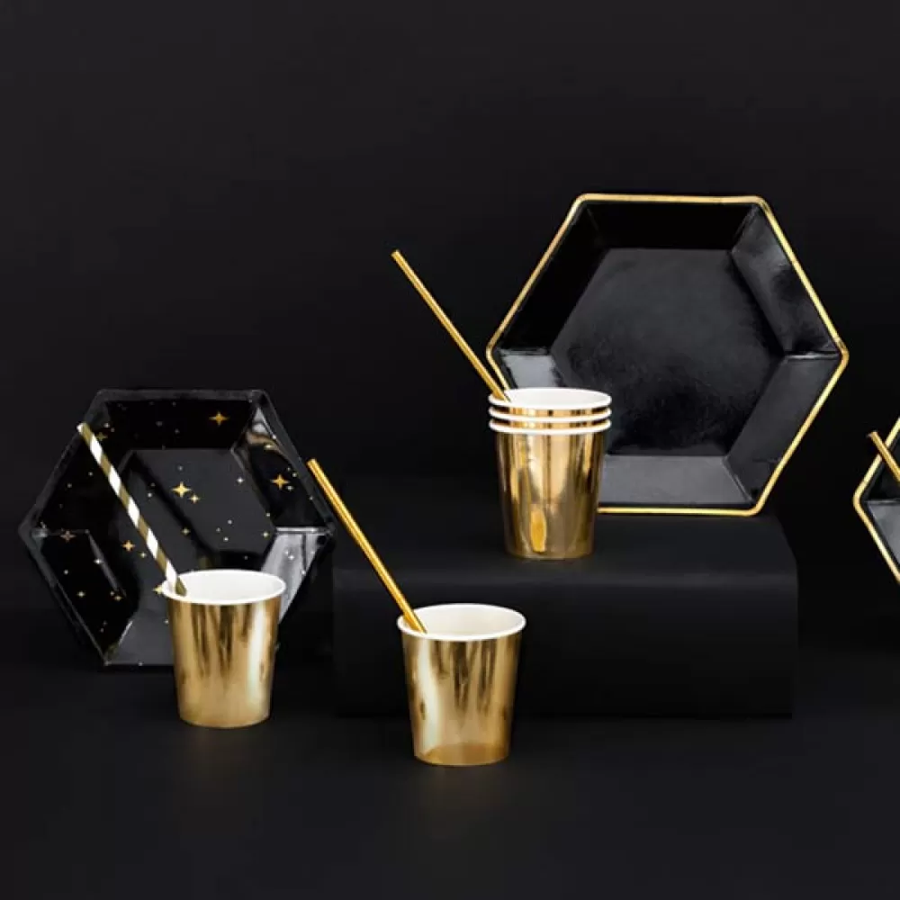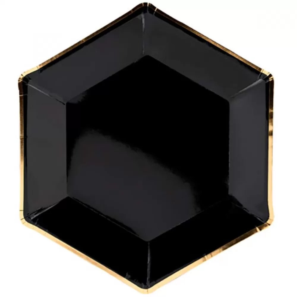 - В наборе 6 бумажных тарелок черного цвета с золотым кантом.