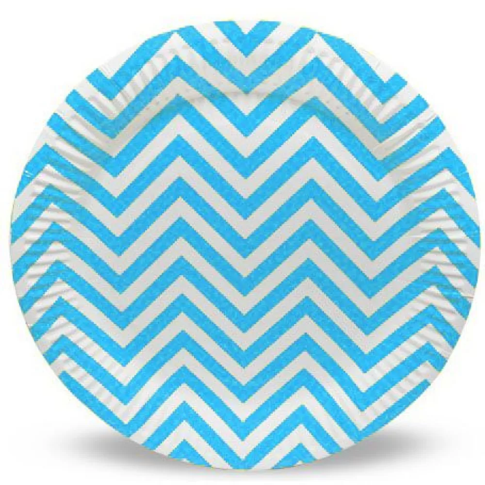 - Одноразовые тарелки голубого цвета с принтом шеврон. В упаковке 6 ламинированных бумажных тарелок.