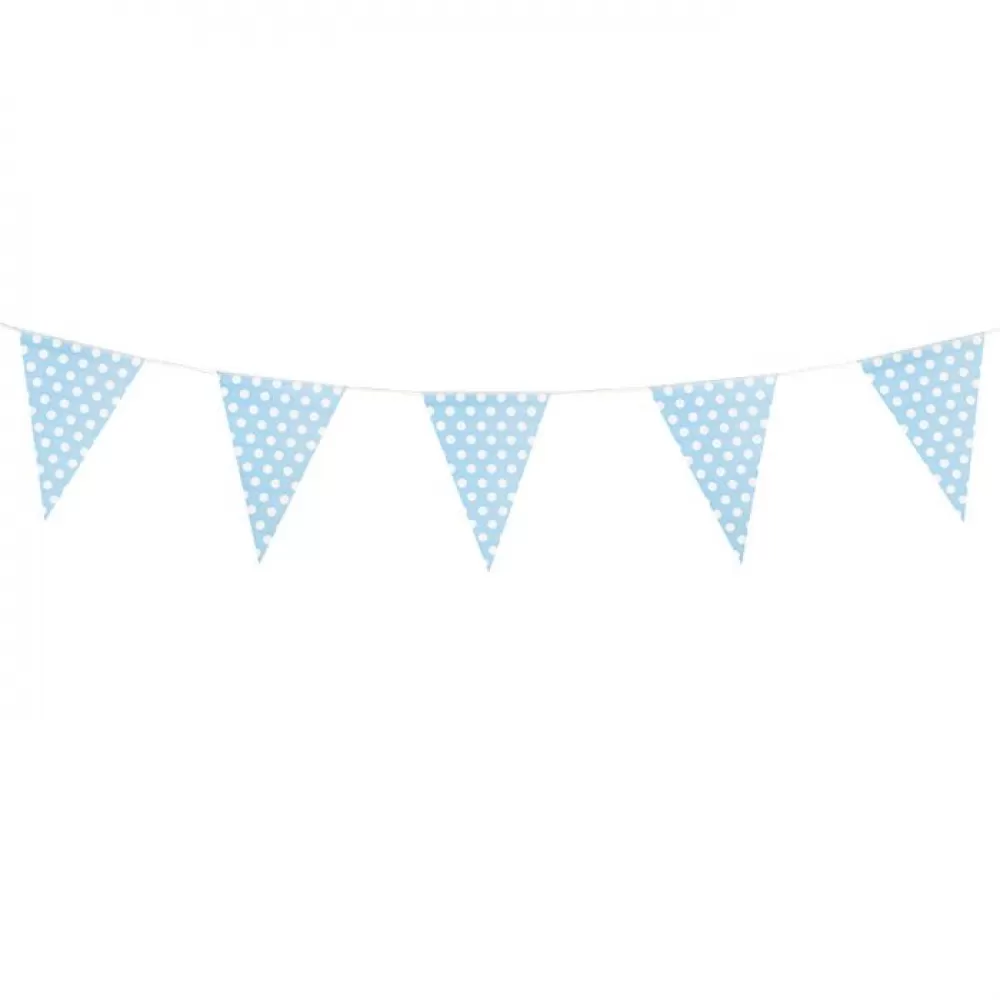 - Бумажные флажки на белой ленте, крупный белый горох на голубом фоне.