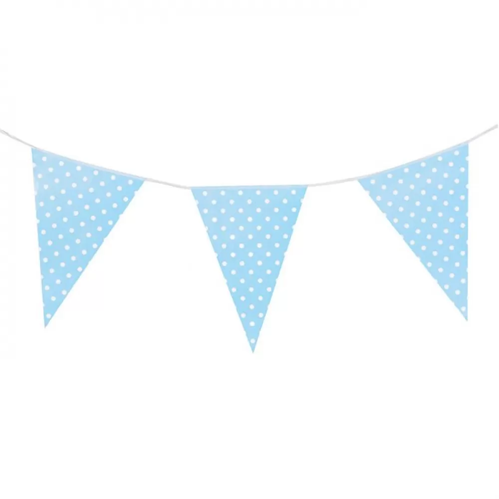 - Бумажные флажки на белой ленте, голубые в белый мелкий горошек.