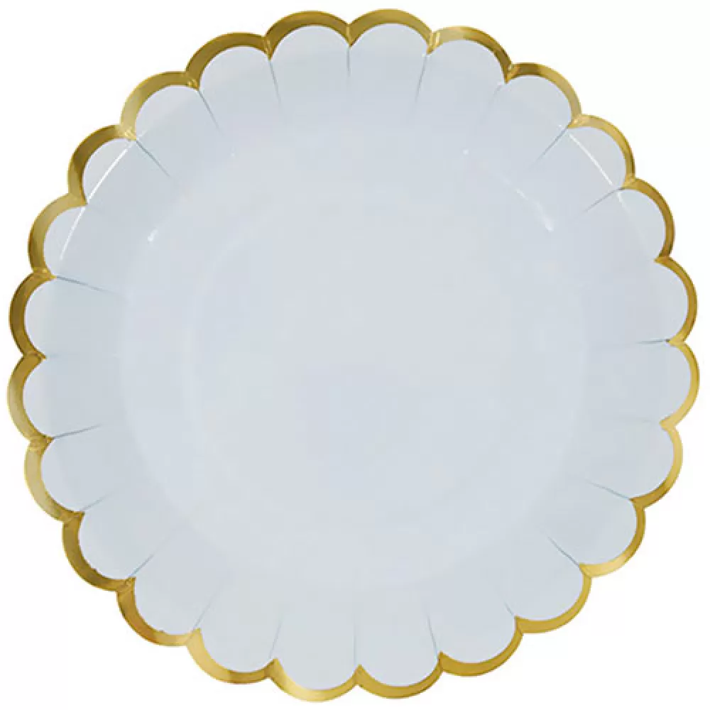 - Тарелки одноразовые бумажные нежно-голубого цвета с золотой каймой. В упаковке 6 ламинированных тарелок.