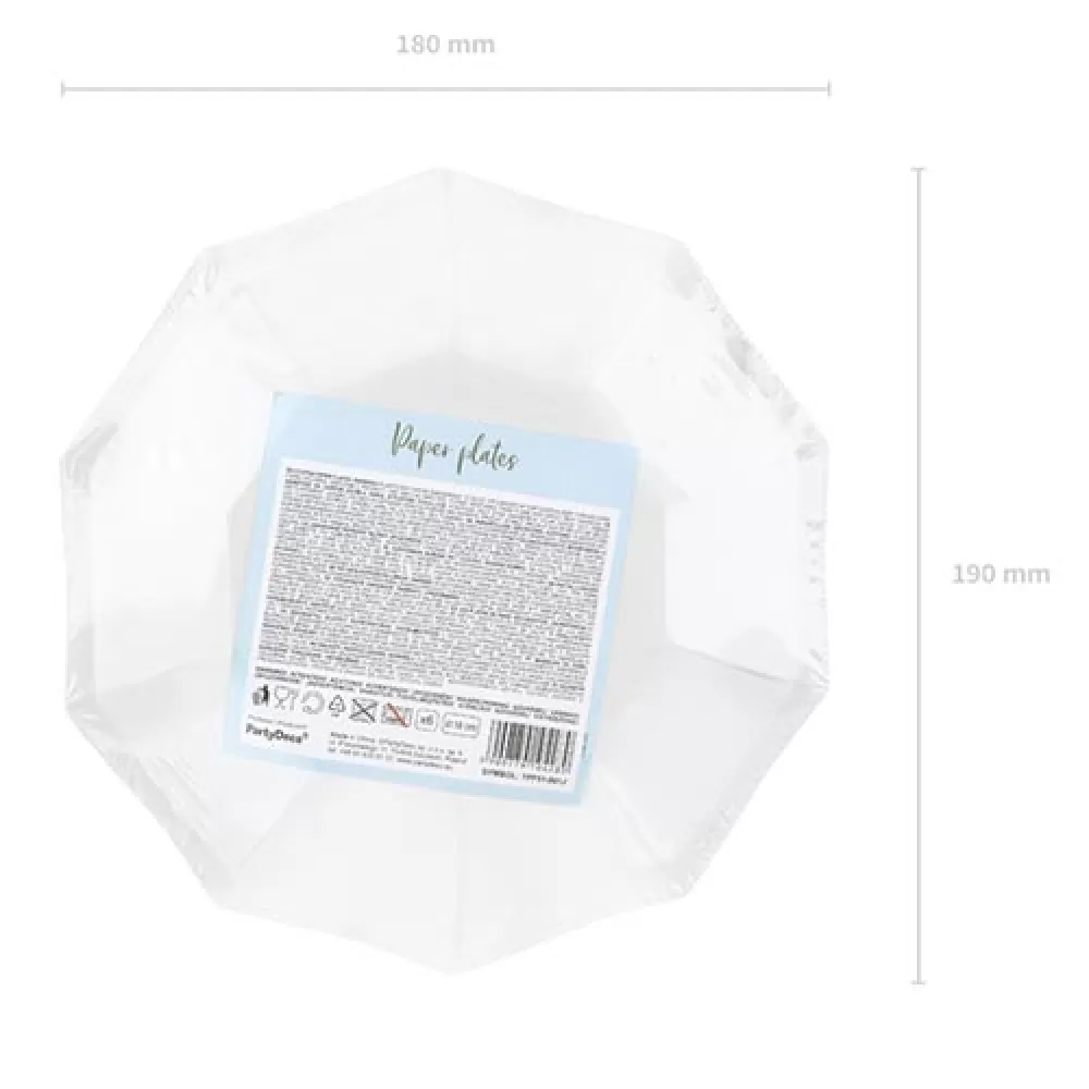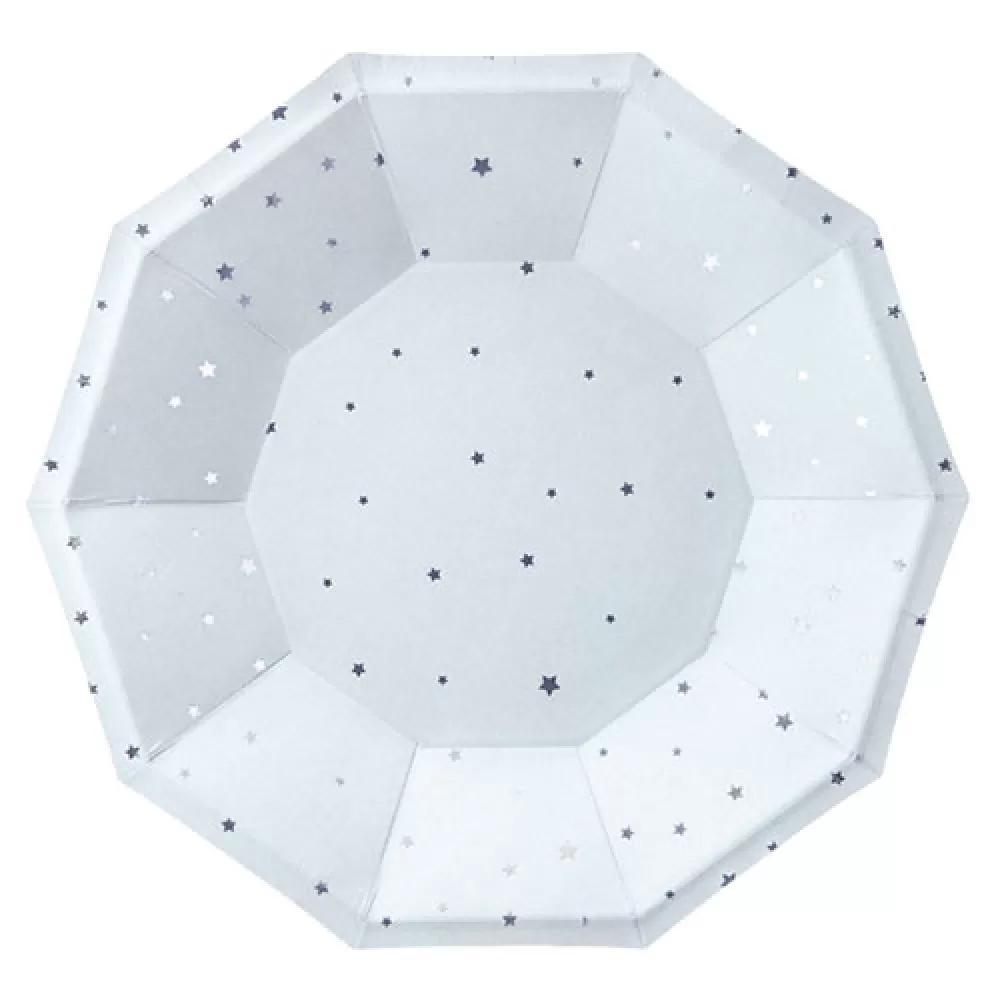 - В упаковке 6 ламинированных тарелок нежно-голубые цвета с серебряными звездочками.