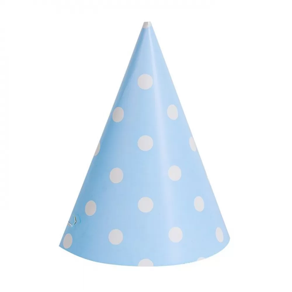 - В наборе 6 бумажных колпачков голубого цвета в белый горошек.Высота колпачка 15 см.