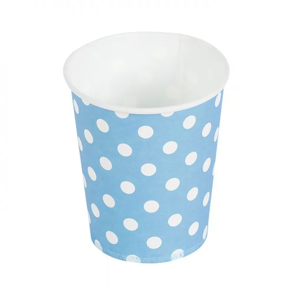 - В наборе 6 бумажных стаканов голубого цвета с принтом горошек.