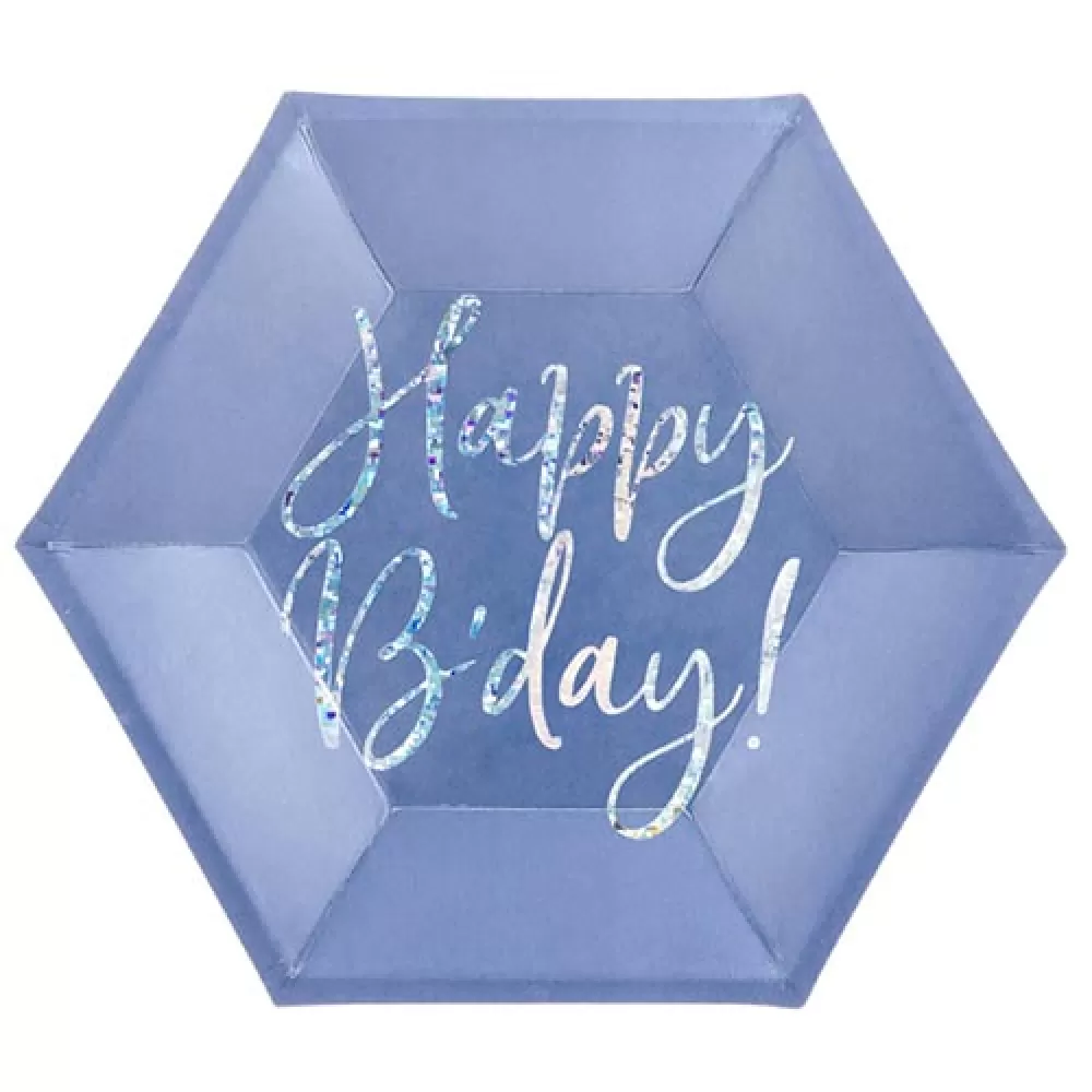- В наборе 6 бумажных тарелок серо-голубого цвета с серебристой голографической надписью Happy B'day! .