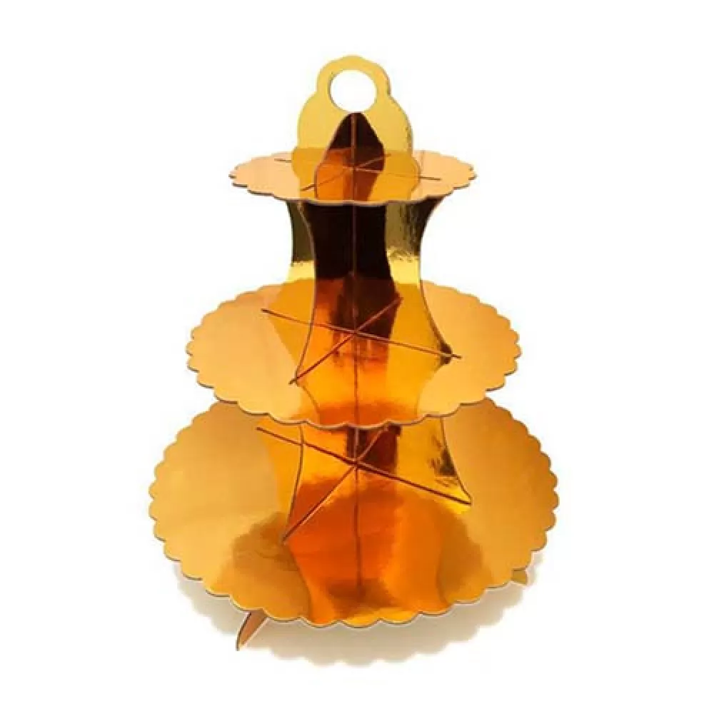 - Стойка трехярусная, выполнена из плотного ламинированного картона золотистого цвета.