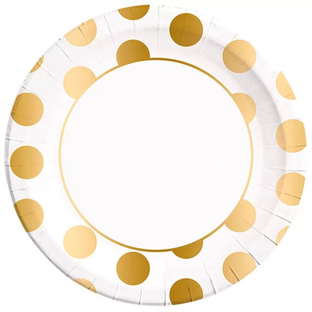 - Большие бумажные тарелки с принтом золотой горошек.
