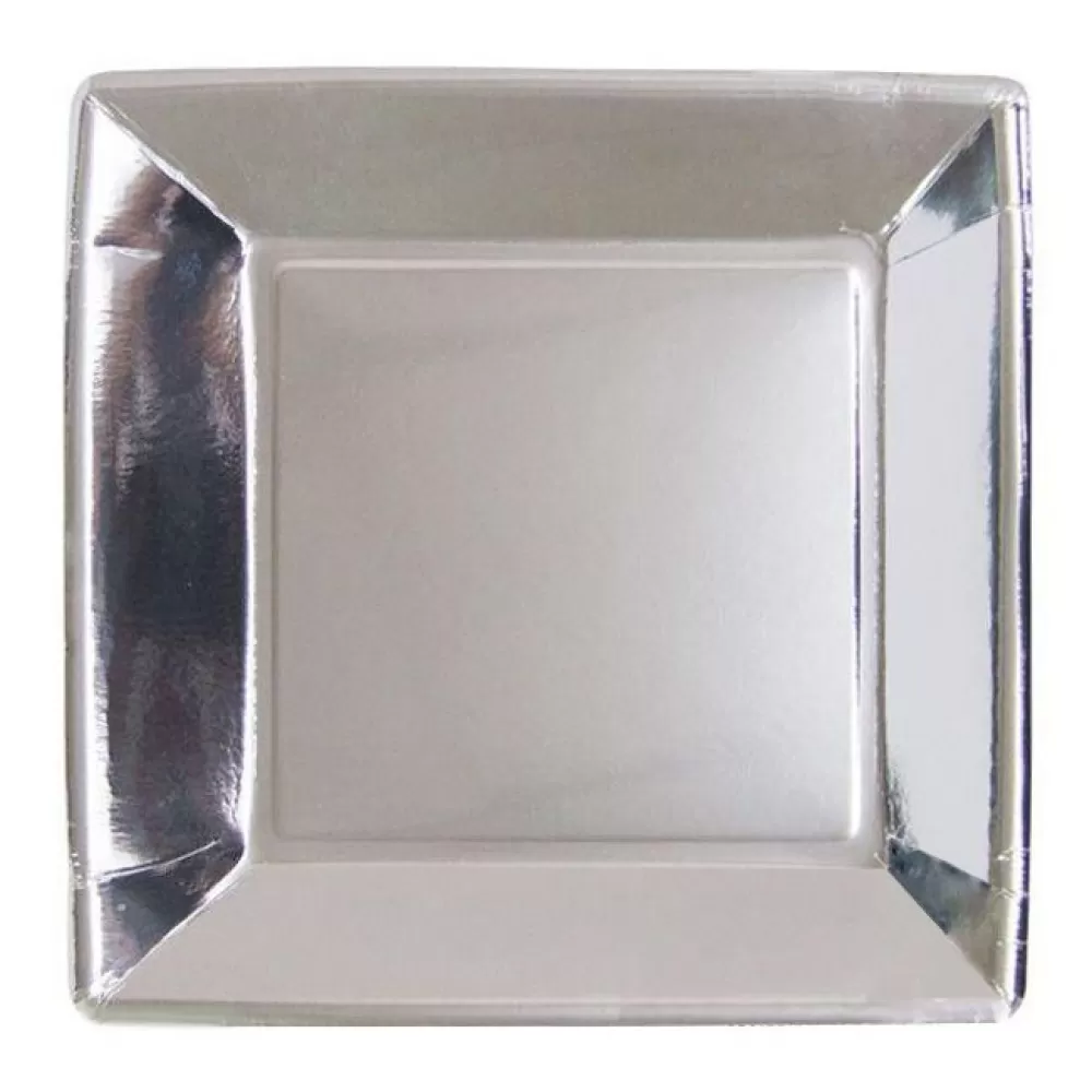- Одноразовые квадратные серебряные тарелки, в наборе 25 бумажных металлизированных тарелок. Размер тарелки 23х23 см.