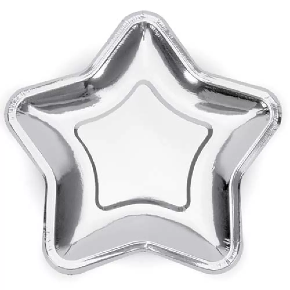 - Одноразовые фигурные бумажные серебряные тарелки в форме звезды.