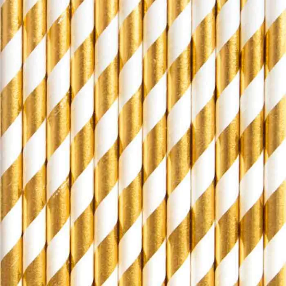 - Золотые в полоску фольгированные одноразовые трубочки для коктейля. В упаковке 25 штук.