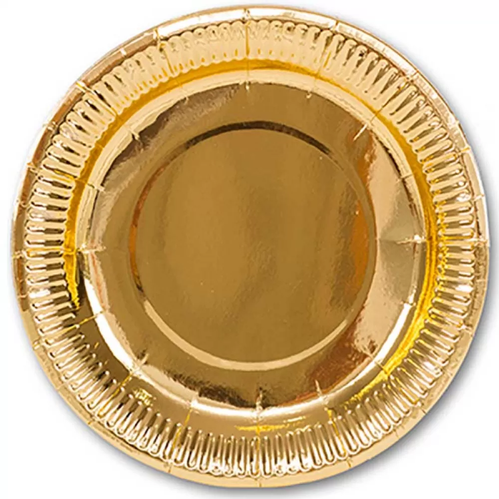 - Золотые одноразовые тарелки, в наборе 6 бумажных тарелок диаметром 18 см.