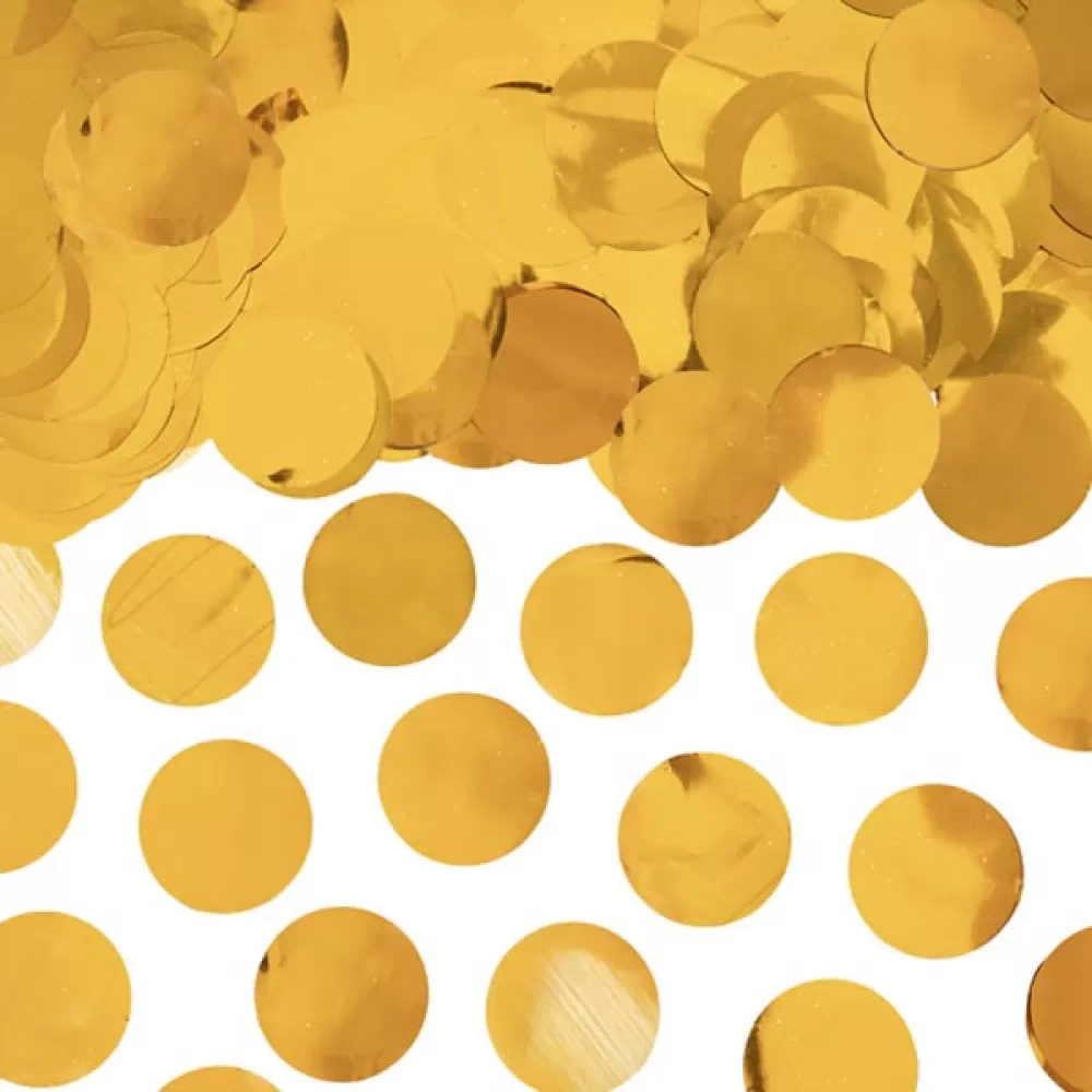 - Фольгированные круглые конфетти из тонкой полимерной пленки золотого цвета подходят в качестве наполнителя для прозрачных воздушных шаров.