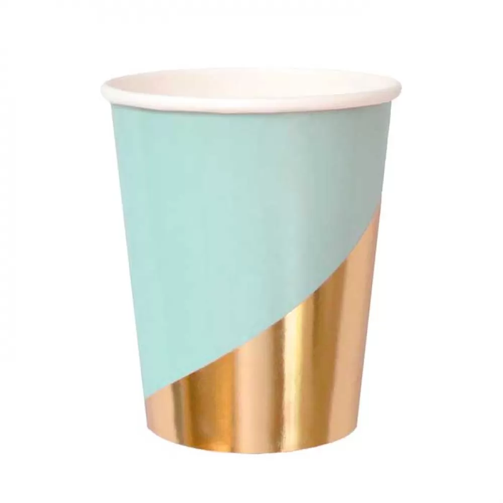- В наборе 6 бумажных стаканов мятного цвета с золотым уголком.