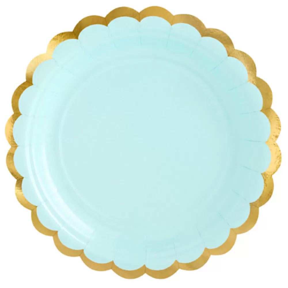- В упаковке 6 ламинированных тарелок мятного цвета с золотой каймой.