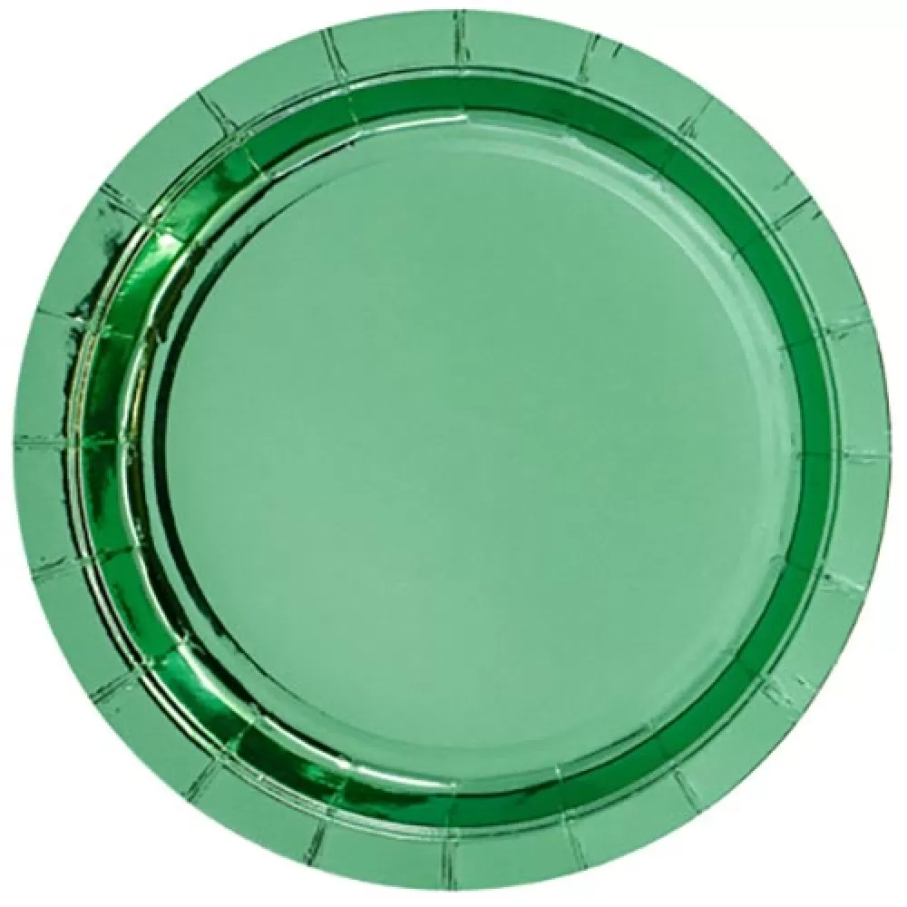 - Одноразовые бумажные зеленые фольгированные тарелки. В упаковке 6 штук.