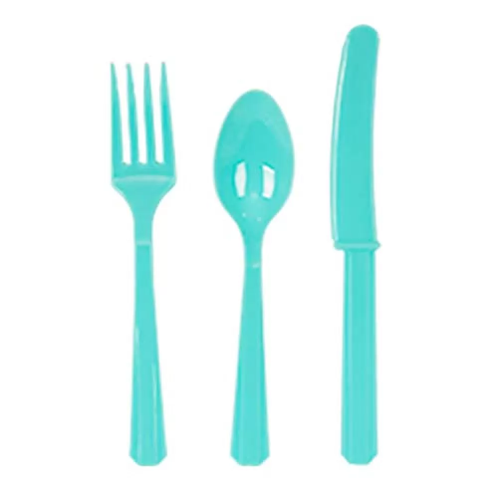 - В наборе 24 столовых прибора на 8 персон бирюзового цвета (нож, вилка, ложка - по 8 шт.).