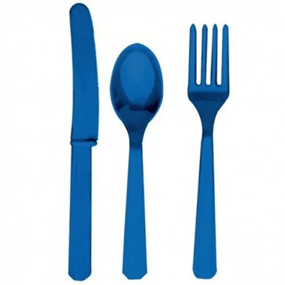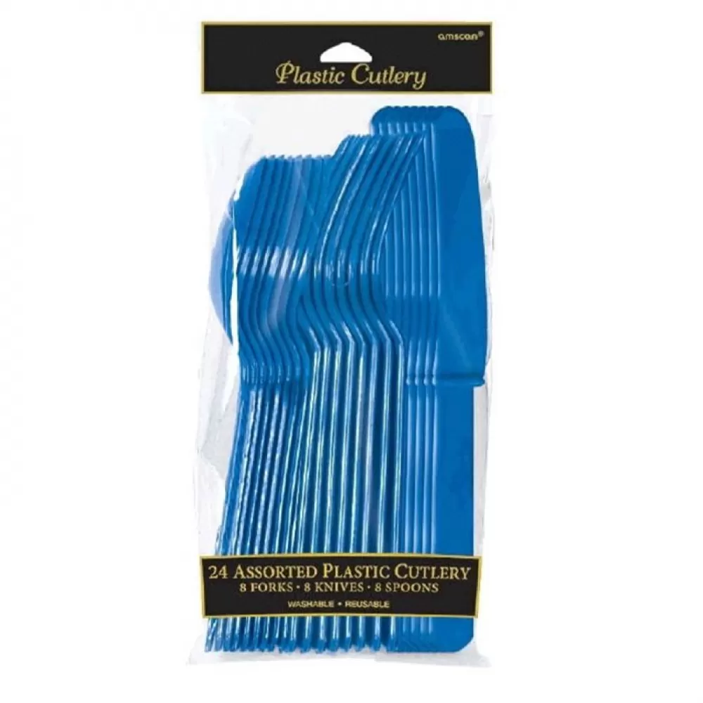 - В наборе 24 синих столовых прибора на 8 персон (нож, вилка, ложка - по 8 шт.).