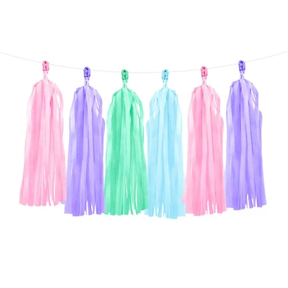 - Набор Гирлянд тассел ассорти состоит из 12 кисточек (розовых, небесно-голубых, зеленых, фиолетовых, по 3 шт.) и около 2 м ленты.