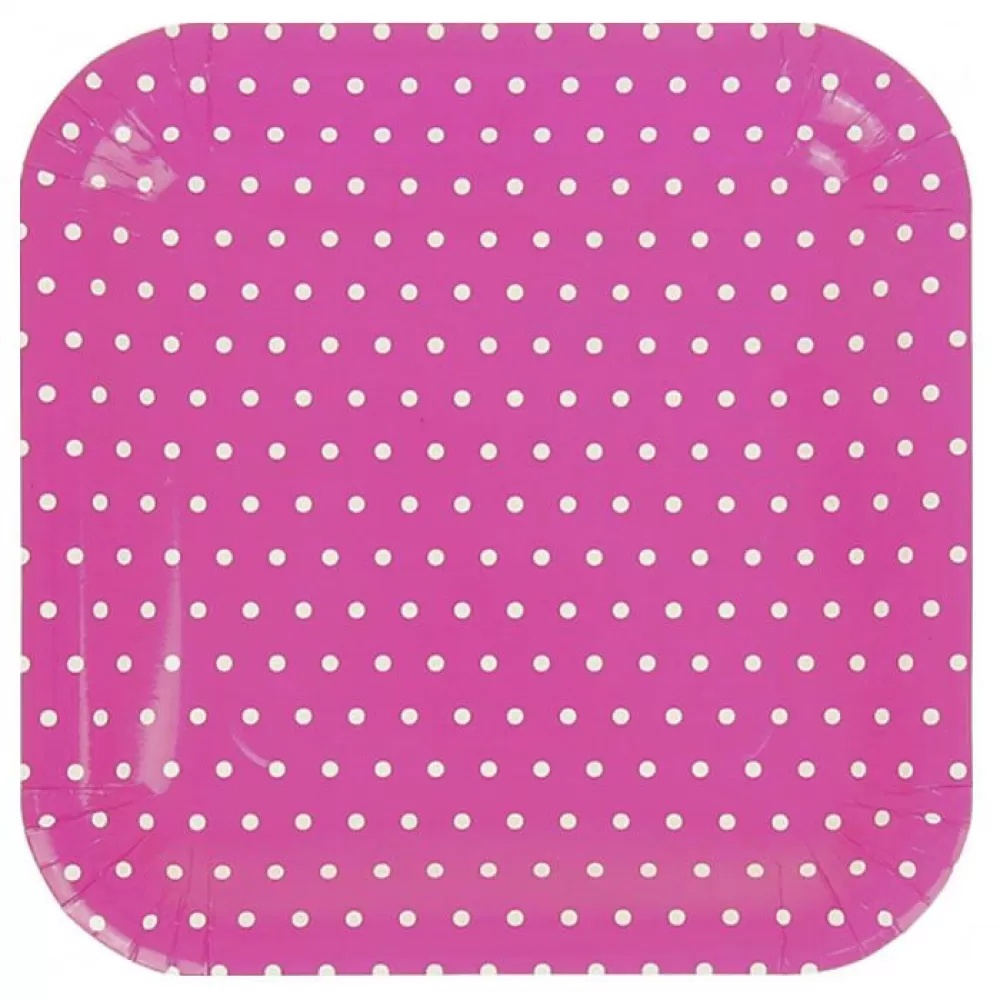 - Тарелки одноразовые ярко-розового цвета фуксия в белый горошек. В наборе 6 бумажных квадратных тарелок.